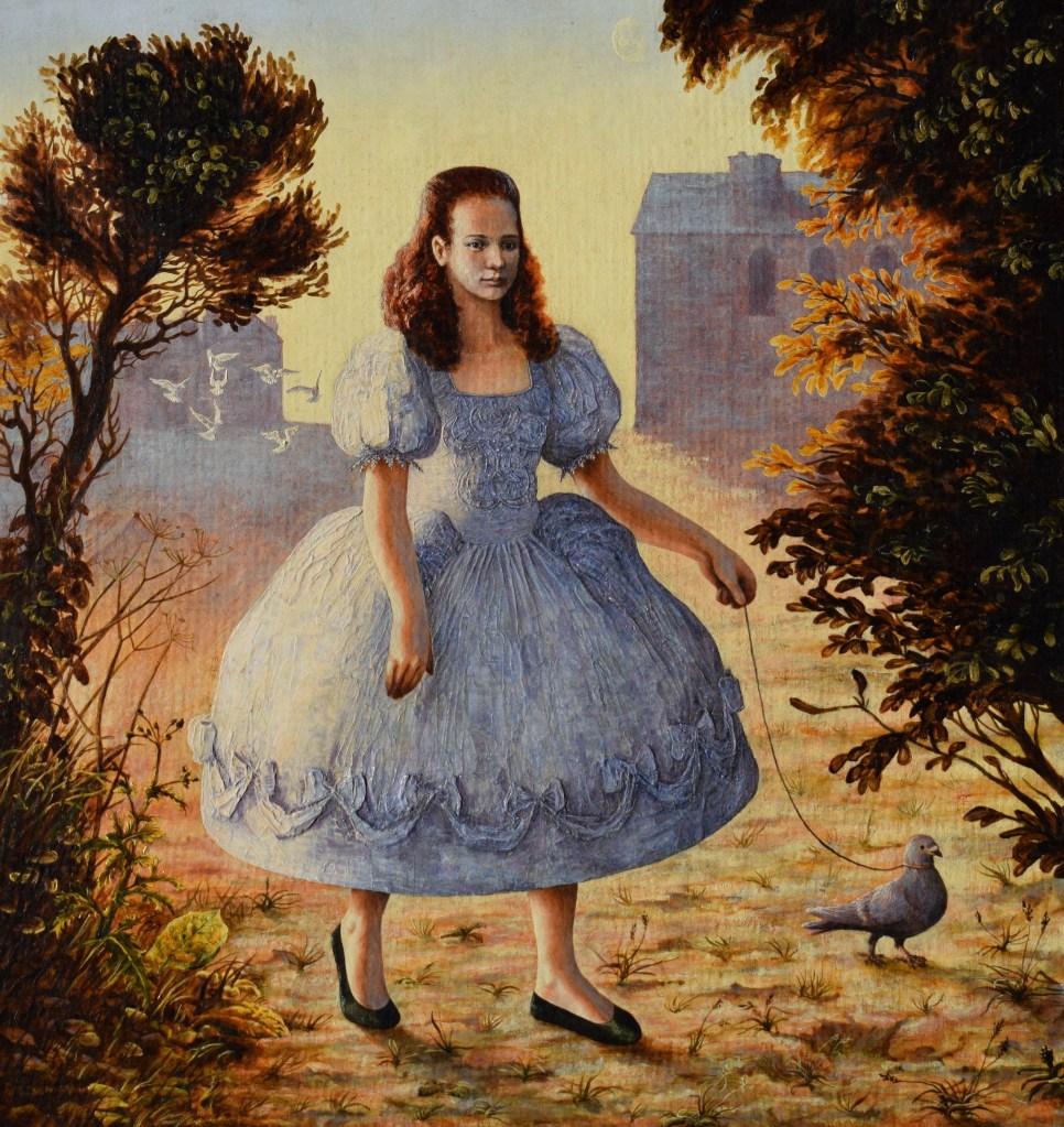 Many years ago, I’d been spending time with this girl, I knew it wasn’t going to go anywhere, and after it was over, I just couldn’t get her out of my head. The scent of her breath, the taste of her lips, her unexpected impulsiveness and so many other things. Anyway, I’d got into transcendental meditation, and this one time an image of a girl with a pigeon on a lead floated into my view. I tried to paint this vision a number of times, and what came to be the final version was intended originally as a sketch but seemed to get at what I was going for, so I worked more on it. This was the best expression of that vision. I added other details including pigeons flying freely in the background, a repeated moon motif in the designs on the dress and also in the sky, I devised a landscape setting. I felt a sort of early renaissance feel was what I wanted to go for. I quite like this picture, of all the pictures I’ve painted this is probably my favourite and so I used it on the cover of the album ‘Some kind of emptiness’.